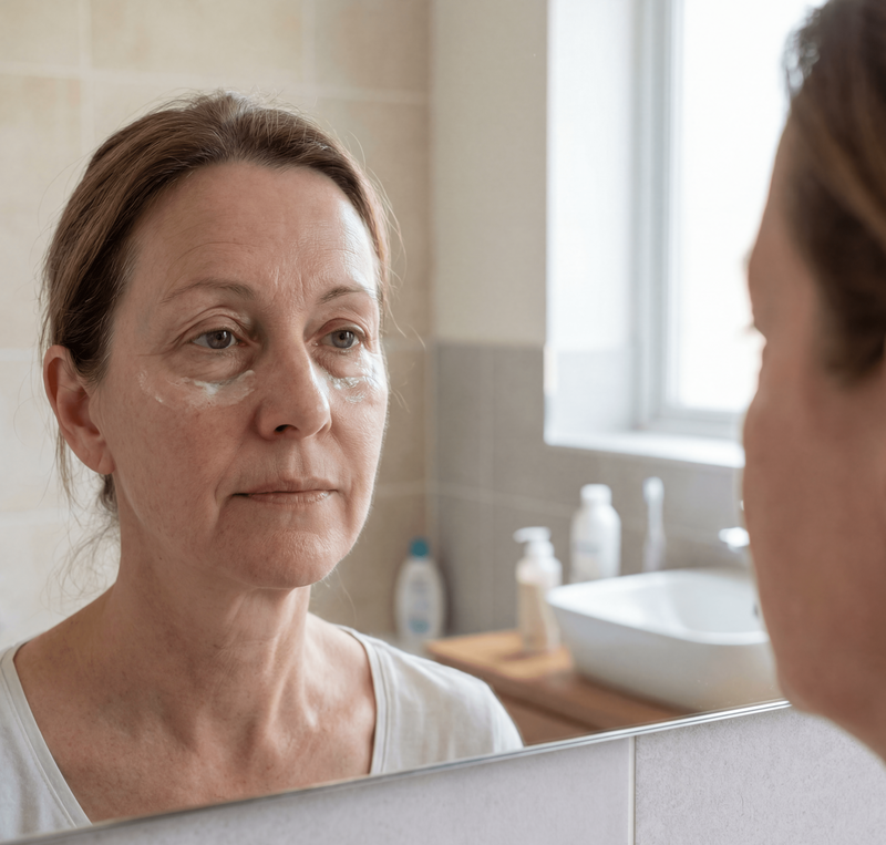 It creates a lightweight tightening layer that helps tired-looking eyes appear more rested and refreshed, without flaking, stiffness, or residue.